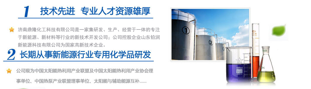 濟(jì)南鼎隆化工科技有限公司是一家集研發(fā)、生產(chǎn)、經(jīng)營于一體的專注于新能源、新材料等行業(yè)的新技術(shù)開發(fā)公司;公司控股企業(yè)山東鉑潤新能源科技有限公司為國家高新技術(shù)企業(yè)。擁有雄厚的科研實(shí)力和專業(yè)銷售隊伍以及多名從事化學(xué)化工專業(yè)的高素質(zhì)人員,其中博士生導(dǎo)師1人,碩士研究生3人。公司現(xiàn)為中國太陽能熱利用產(chǎn)業(yè)聯(lián)盟及中國太陽能熱利用產(chǎn)業(yè)協(xié)會理事單位、中國熱泵產(chǎn)業(yè)聯(lián)盟理事單位、山東清潔能源供暖產(chǎn)業(yè)聯(lián)盟理事單位、太陽能與輔助能源互補(bǔ)供熱/制冷工程專業(yè)委員會會員單位。公司專注于綠色科技,專業(yè)化研發(fā)環(huán)境友好型化工產(chǎn)品,與眾多高校和國內(nèi)外多家著名化學(xué)品公司保持戰(zhàn)略合作關(guān)系。公司擁有“載能”和“澤能”...更多